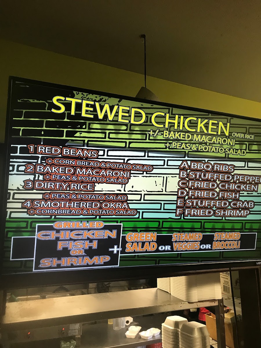 - Daily Specials: Includes classic soul food entrées such as stewed chicken, red beans, baked macaroni, dirty rice, and smothered okra. Smaller portions are also available for some items, suitable for lighter meals.