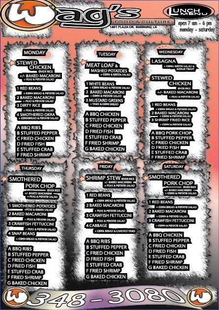 - Highlighted Dishes: The menu features items such as lasagna, sweet potato pie, liver and onions, grilled chicken salad plates, grilled chicken and shrimp salad, French toast with bacon, and dirty rice, covering both main courses and side dishes.