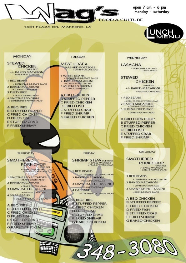 The menu at Wags Food & Culture offers a variety of traditional soul food dishes and sandwiches, alongside a selection of beverages. It is organized into several groups to accommodate different meal preferences and times of the day.